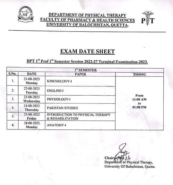 The University of Balochistan, renowned for its excellence in education, is all set to conduct the UOB DPT 1st Prof 1st Semester Session 2022-27 Terminal Examination-2023. Anticipation is building as the eagerly awaited UOB DPT Exam date sheet 2023 has been unveiled. Marking a pivotal moment for students, the exams are scheduled to commence on August 21, 2023, and will conclude on August 28, 2023.
