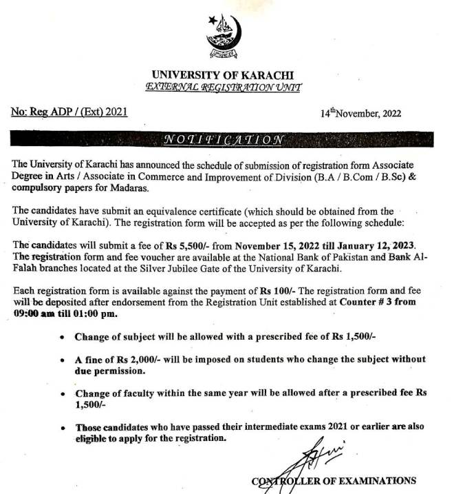 Karachi, University of Karachi is going to start the process of submission of admission forms with the payment of admission fee for Associate Degree in Arts and Commerce and improvement of Division BA, B.Com and BSc and compulsory papers for Madaras. The candidates will note their UoK ADA & ADC Annual Exams 2023 Forms Schedule and they submit their application forms with the fee of Rs.5500/- from 15-11-2022 to 12-01-2023. The admission forms and fee voucher are provided at NBP and Bank Al-Falah branches, which are located at Silver Jubilee Gate Branch, Karachi University.
