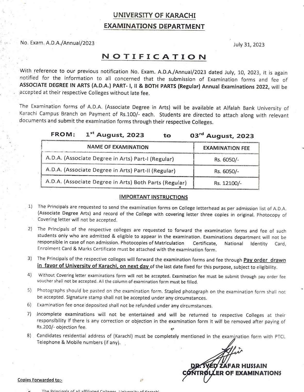 Karachi, University of Karachi will start their Associate Degree in Arts part 1, 2 and both parts annual exams 2022 at the respective colleges at the end of the academic year. The students, who want to appear in the coming KU ADA Annual Exams 2022, they are asked to submit their application forms according to their UoK ADA Annual Exams 2022 Schedule. The admission forms are available at Alfalah Bank University of Karachi campus for Rs.100/- each payment and the students attach the relevant documents with the application forms and send it from 01-08-2023 to 03-08-2023. The students can read the rate of the admission fee and they will deposit this fee to send their application forms so that they can be eligible to participate in the coming exams.