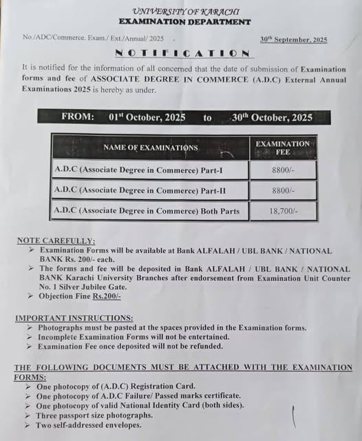 Karachi – University of Karachi UoK has announced the schedule for submission of admission forms for the Associate Degree in Commerce ADC External Annual Examinations 2025. The exams will be conducted according to the officially scheduled dates and timings. To help students prepare for the upcoming exams, the examination department of Karachi University has released the UoK ADC External Annual Exams 2025 Forms Schedule, outlining the process and deadlines for form submission and fee payment. The students can get latest information of UoK ADC External Annual Exams 2025 Admission Forms Schedule.