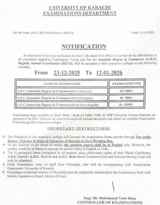 Karachi, The University of Karachi has issued an official notification regarding the A.D.C Associate Degree in Commerce Regular Annual Examinations 2025-26. Students of the A.D.C Part-I, Part-II, and both parts are required to submit their examination forms through their respective colleges within the schedule.