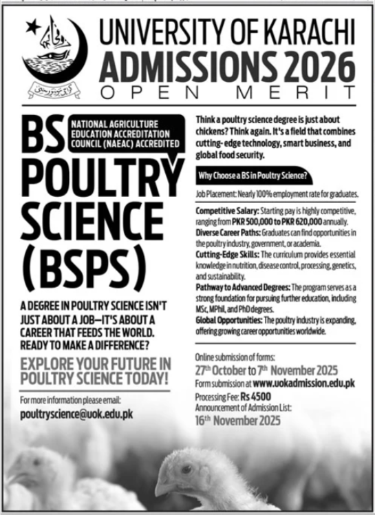 The University of Karachi UoK is now accepting applications for its BS in Poultry Science BSPS program for 2026 admissions. This degree, accredited by the National Agriculture Education Accreditation Council NAEAC, offers students a unique opportunity to build a career that contributes to global food security and the growing poultry industry.