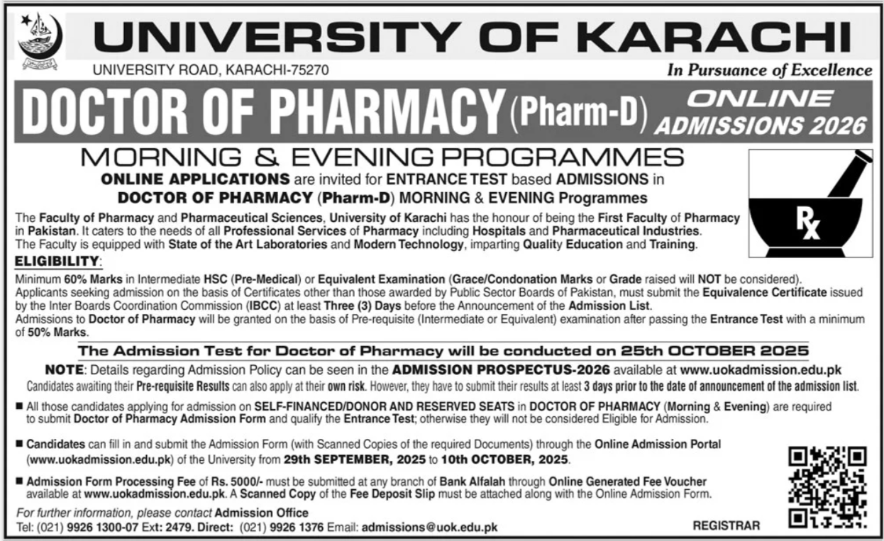 The University of Karachi UoK invites online applications for entrance test-based admissions to the Doctor of Pharmacy Pharm-D program for the 2026 academic session. Admissions are open for both Morning and Evening programs under the Faculty of Pharmacy and Pharmaceutical Sciences — the first and one of the most prestigious faculties of Pharmacy in Pakistan.
