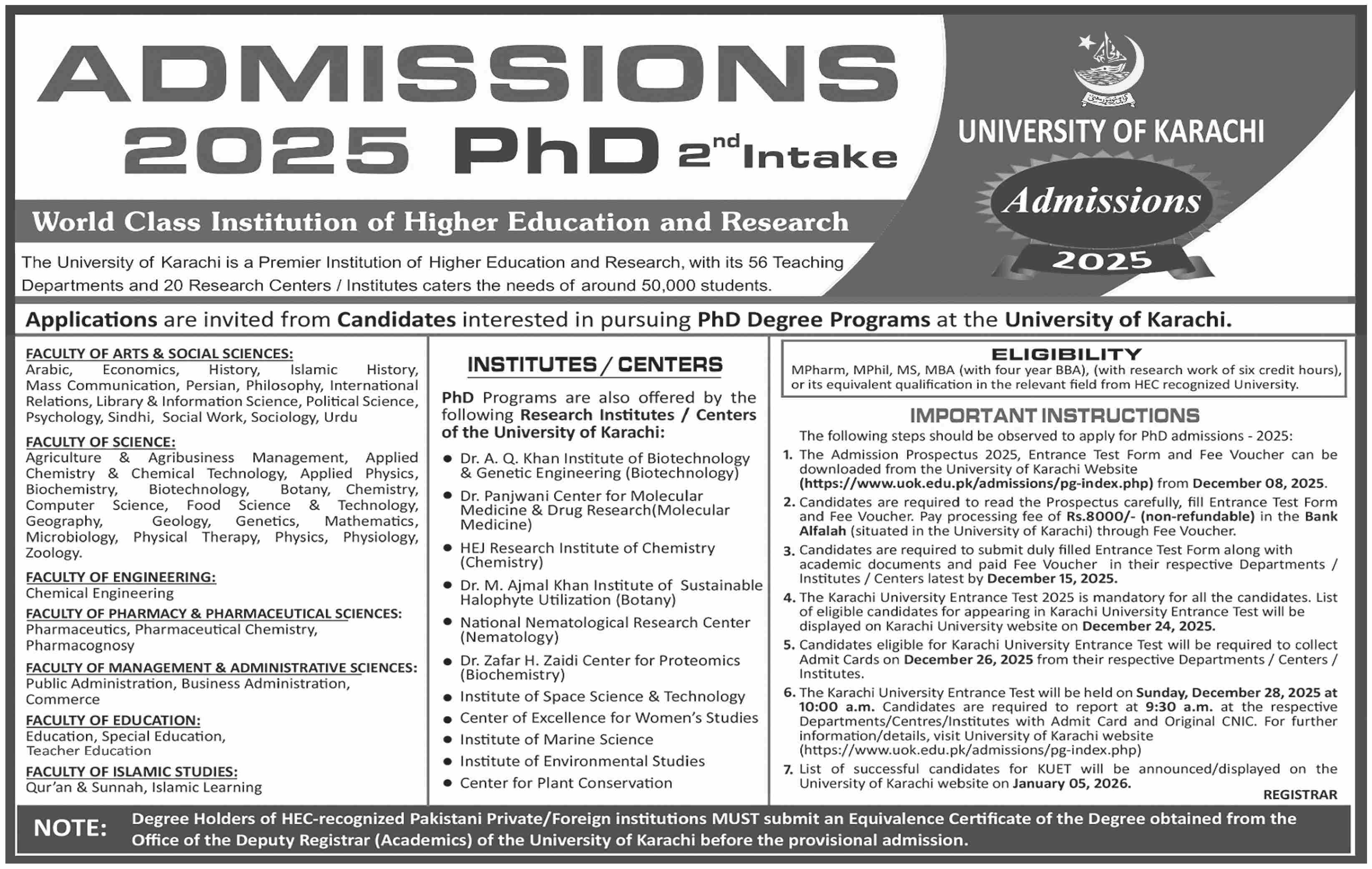 - Download Admission Prospectus & Forms: Available from 8th December 2025 at University of Karachi Admissions Portal
