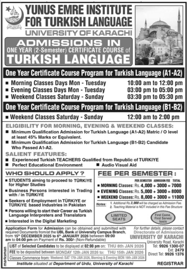 The University of Karachi, in collaboration with the Yunus Emre Institute for Turkish Language, invites applications for its One-Year Two-Semester Certificate Course in Turkish Language. This program is designed to provide structured and practical training in Turkish language proficiency, ranging from beginner to intermediate levels, and is ideal for students, professionals, and individuals seeking international opportunities.