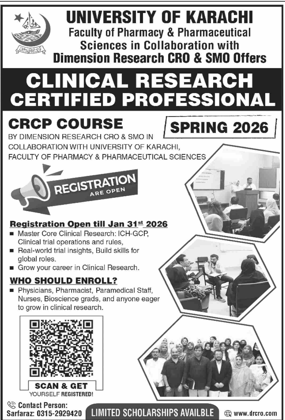 The University of Karachi UOK is one of Pakistan’s most respected public sector institutions, recognized for excellence in research and professional education. Under UoK Admissions 2026, the Faculty of Pharmacy & Pharmaceutical Sciences, in collaboration with Dimension Research CRO & SMO, is offering a highly in-demand Clinical Research Certified Professional CRCP Course for Spring 2026, creating exceptional opportunities for healthcare and bioscience professionals.