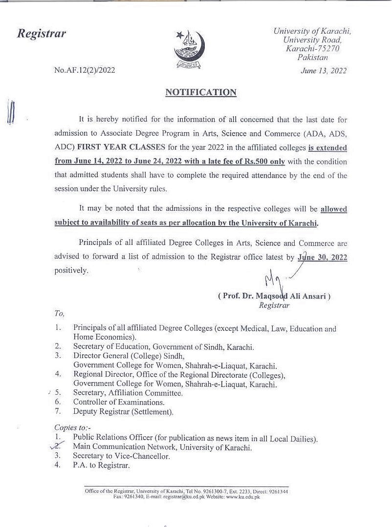 Karachi, University of Karachi is going to start their UoK ADA 1st year annual exams 2022, UoK ADS 1st year annual exams 2022 and UoK ADC 1st year annual exams 2022. The exams section of Karachi University started the receipt of the admission forms from the students and after that Karachi University has accorded UoK ADP 1st Year Classes Exams Forms Schedule 2022 Extension. The students can submit their application forms with the payment of late fee of Rs.500/-from 14-06-2022 to 24-06-2022. Karachi University advised the principals of all affiliated degree colleges in arts, science and commerce to forward list of the admission to the registrar office by 30-06-2022.