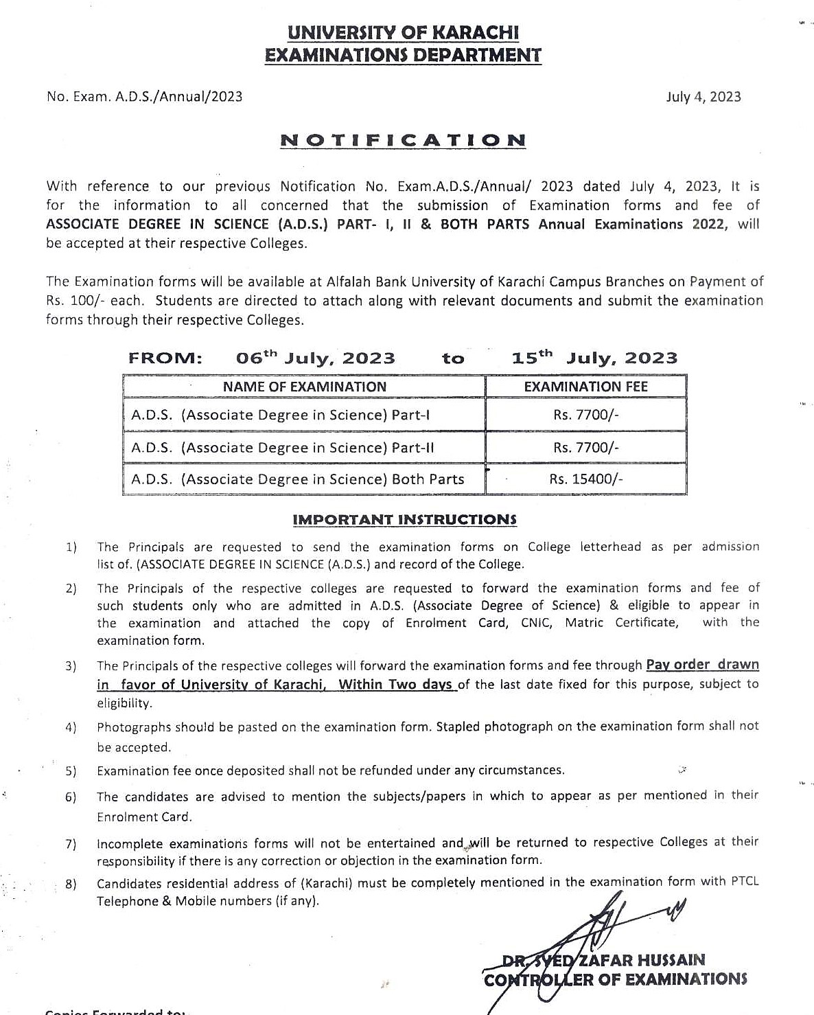 Karachi, University of Karachi is going to start their KU ADS Annual Exams 2022 of part 1, 2 and both parts. The interested candidates can get their exams forms from AlFalah Bank, Karachi University campus branches on the payment of Rs.100/- each. The students need to attach the relevant documents with the application forms and submit them through their respective colleges. The candidates can get the latest updates of UoK ADS Annual Exams 2022 Exams Forms Schedule and students can send these application forms with regular fee payment from 06-07-2023 to 15-07-2023. The students will pay the fee, which is mentioned in their schedule and they will follow them while depositing their admission fee.