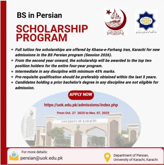 Karachi, University of Karachi is going to award the scholarships in BS in Persian for the session 2026. The scholarships are added with full tuition fee for grant of admission in the BS Persian. The students, who seek admission in the BS Persian, they can avail this scholarship according to the notification that UoK Announces BS in Persian Scholarship Session 2026.