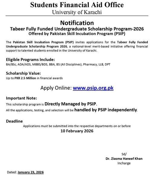 The Students Financial Aid Office at the University of Karachi has announced an important scholarship opportunity for undergraduate students under the Tabeer Fully Funded Undergraduate Scholarship Program 2026. This scholarship is being offered through the Pakistan Skills Incubation Program PSIP and aims to provide need-based financial assistance to talented students enrolled at the University of Karachi. The students can get the latest updates that UoK Announces PSIP Fully Funded Undergraduate Scholarship 2026.