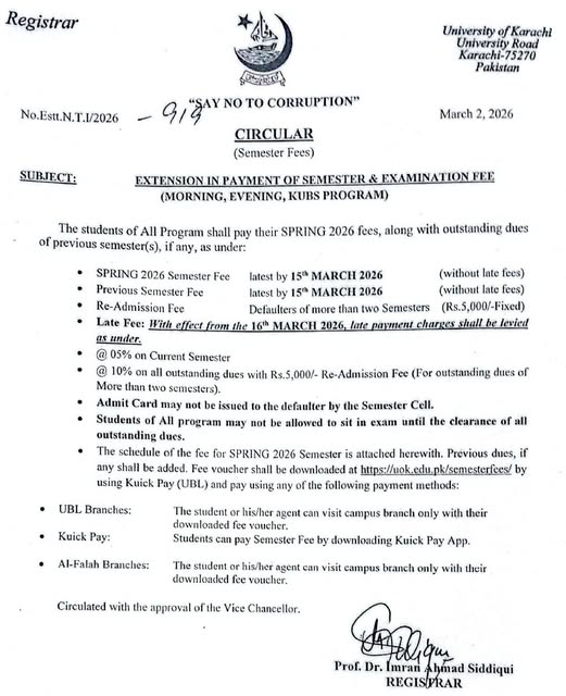 The Registrar Office of the University of Karachi, located on University Road, Karachi-75270, has issued an official circular dated March 2, 2026, under reference number Estt.N.T.1/2026. Through this notification, the university has informed all students enrolled in Morning, Evening, and KUBS programs about an extension in the deadline for the payment of Spring 2026 semester and Exam fees. The announcement has been made with the approval of the Vice Chancellor. The students can get the latest information regarding UoK Announces Revised Deadline for Spring 2026 Semester & Exam Fees.