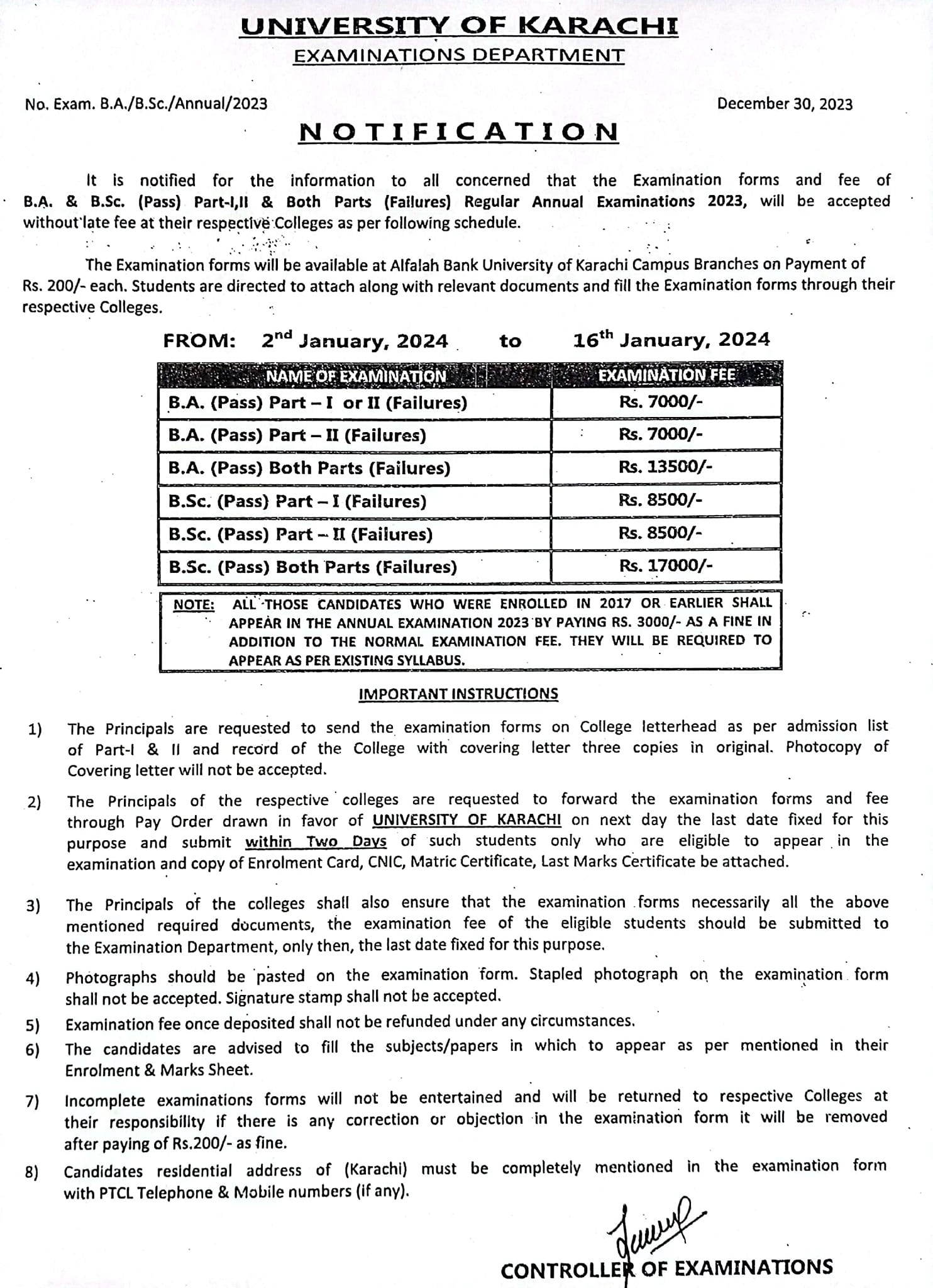 Karachi, University of Karachi will start the complete process of the BA & BSc Part 1, 2 & both parts failure regular annual exams 2023 students and the exams department will collect their admission forms with regular fee to ensure their attendance in the coming UoK BA & BSc Annual Exams 2024. The candidates will collect the admission forms from the AlFalah Bank Karachi University campus branch on the payment of Rs.200/- each.