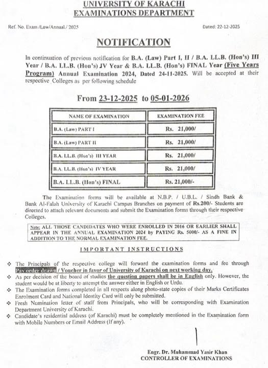 According to the Karachi University schedule, students can submit their examination forms through their respective colleges from December 23, 2025, to January 5, 2026.