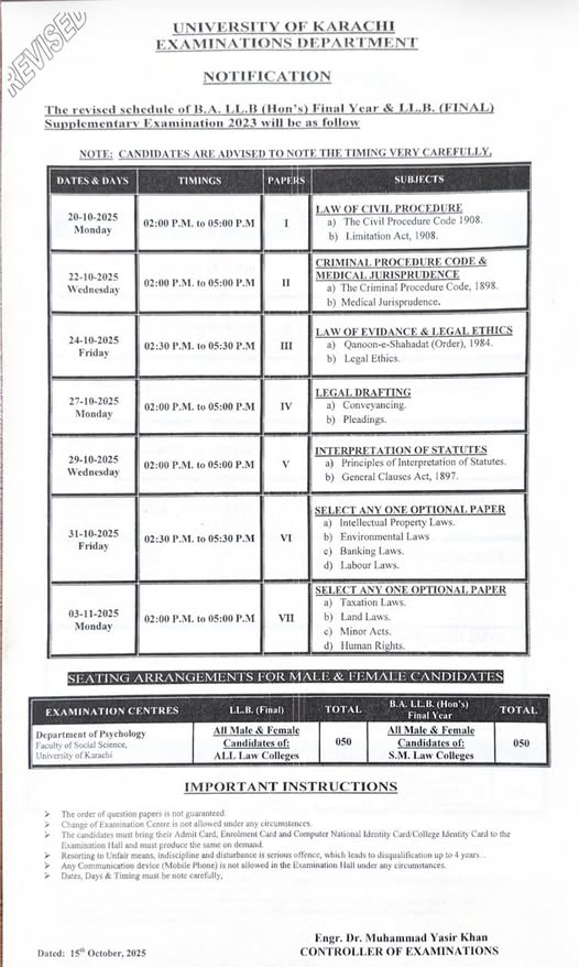 Karachi, University of Karachi is going to conduct the BA LLB Hons final year and LLB Final supply exams for the year 2023. The exams section of Karachi University collected the admission forms from the students and issued their roll no slips and UoK BA LLB Hons Final Supply Exams 2023 Revised Date Sheet to the students allowing them to appear in the next coming exams. The students can get detailed updates of the dates and time of their respective papers.