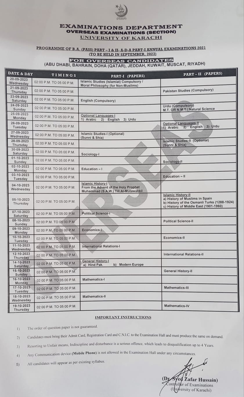 Karachi, University of Karachi will start their UoK BA Pass & ADA annual exams 2021 in the allotted exams centers. The exams department of Karachi University collected the admission forms from the students and issued their UoK BA Pass & ADA Annual Exams 2021 Date Sheet and the papers will be conducted from 20-09-2023 to 19-10-2023 in the evening session starting from 02:00 pm to 05:00 pm. The students will note the dates and time of all papers and they will appear in their exams on the given date and time.