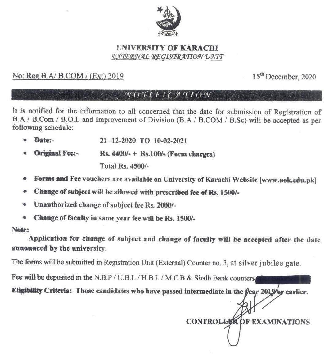 Karachi, University of Karachi has granted the admissions to the eligible candidates in BA/BSc & BOL and B.Com programs. The admission department of Karachi University has issued their UoK BA/BSc & B.Com Registration 2021 for the newly admitted candidates. According to the UoK BA/BSc & B.Com Registration Schedule 2020, the candidates can submit their application forms with the payment of registration forms of Rs.4500/- from 21-12-2020 to 10-02-2021. The forms and fee vouchers are provided on the official website of Karachi University and the candidates can send their application forms at the Registration Unit (External), Counter No.3, Silver Jubilee Gate of Karachi University and pay the fee in NBP, UBL, HBL, MCB and Sindh Bank counters.