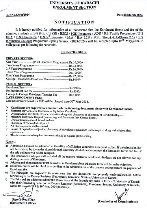 Karachi, University of Karachi is going to start the bachelors degree spring semester exams 2024 for the candidates of Karachi University, who will apply by submission of their admission forms. The candidates can submit their application forms for BS HE, BSSE, BSCS, PGD Insurance, ADE, BS Textile Program, BS, BBA, BS Commerce, BS 5th Semester, MA, BA LLB, B.Ed Hons, B.Ed Hon 2.5, BS Ordnance College program for the spring session 2023-24. The candidates can get the latest updates of UoK Bachelors Spring Semester Exams 2024 Enrolment Schedule and they are advised to forward their application forms by the final date of 06-05-2024.