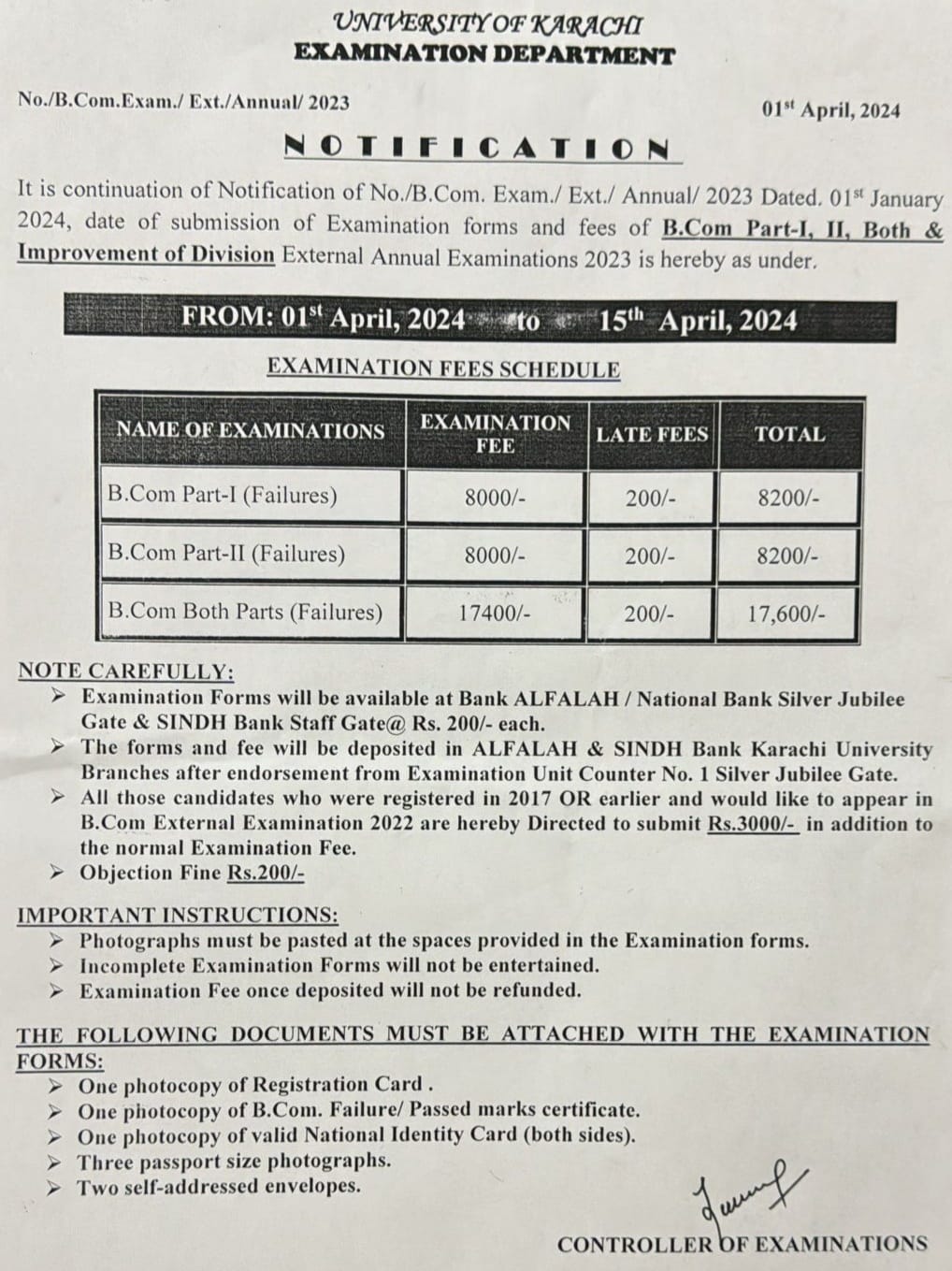 The students will note the rate of the admission fee and the students of part 1 and 2 will deposit the fee of Rs.8000/- each group. The students, who want to appear in both parts, they will pay the fee of Rs.17400/-. The exams department will receive the late fee of Rs.200/- for each group. The students will get the exams forms from Bank Al-Falah / National Bank Silver Jubilee gate and Sindh Bank. The students will deposit the forms and fee in the concerned bank branches of Karachi University after necessary endorsement from Exams Unit counter No.1, Silver jubilee gate.