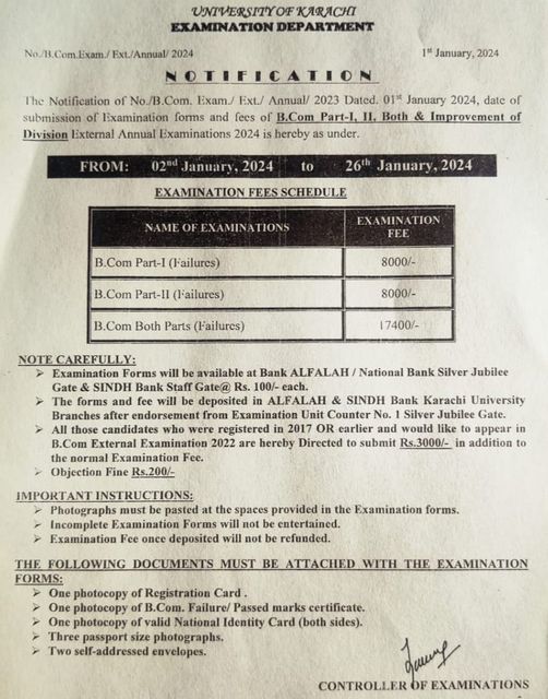 The students will note that they will submit their application forms with normal fee from 02-01-2024 to 26-01-2024. The students of B.Com Part 1 or part 2 failures will deposit the fee of Rs.8000/- each and the students of B.Com Both Parts failures will pay the fee of Rs.17400/-. The students will read the instructions and they should follow them at the time of submission of admission forms and deposit the fee accordingly.