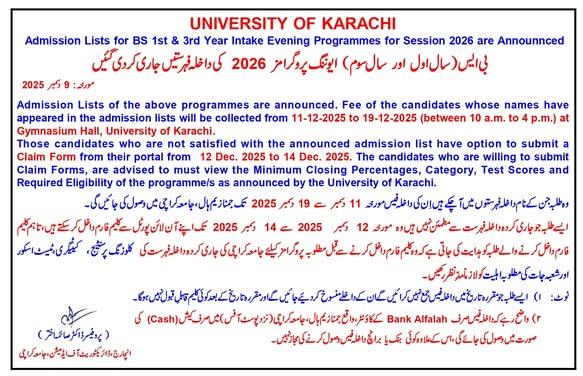 Karachi, University of Karachi has started the admission process in the BS first and second year evening programs for the year 2026. The admission department of Karachi University has announced their UoK BS 1st & 3rd Year Evening Programs 2026 Admission Lists. The candidates, whose names are appeared in the admission list, they will pay the admission fee from 11-12-2025 to 19-12-2025 from 10:00 am to 04:00 pm.