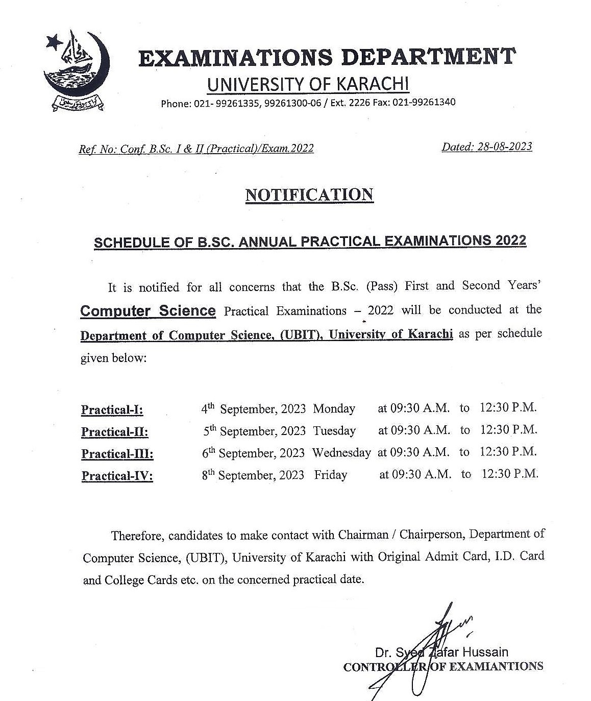 Karachi, University of Karachi will start their KU BSc Annual Exams 2022 practical for the students to appear in the BSc Pass first and second years Computer Science practical exams 2022. The exams department of Karachi University has issued their UoK BSc Annual Practical Exams 2022 Schedule and the practical exams will be administered at the Department of Computer Science, UBIT, University of Karachi from 04-09-2023 to 08-09-2023. The practical exams will be conducted from 09:30 am to 12:30 pm and the students will produce their original admit cards, ID cards and college cards etc on the concerned date of their practical exams.