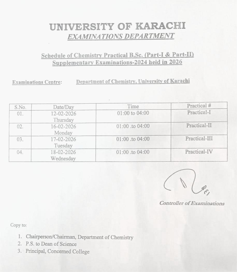The students will note that the practical exams of the BSc Chemistry will be managed from 12-02-2026 to 18-02-2026. The duration of the practical exams will be started from 01:00 pm to 04:00 pm. The students will note the exams center, which will be Department of Chemistry, Karachi University.