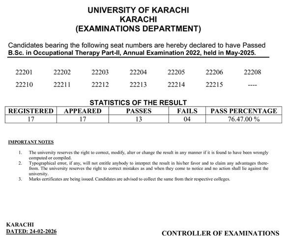 The University of Karachi UoK Examinations Department has officially released the result for the B.Sc. in Occupational Therapy, Part-II Annual Examination 2022. This long-awaited announcement follows the examinations that were conducted in May 2025. Students who appeared for these professional exams can now check their passing status / result through the official seat numbers provided by the university.