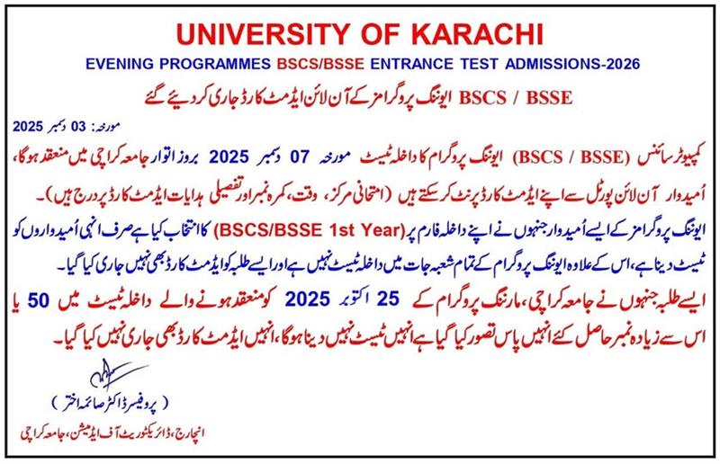 Karachi, University of Karachi is going to grant admission to the students in the BSCS and BSSE programs in the evening session and the students have submitted their application forms for grant of admission in these programs. Now the admission department of Karachi University has issued the UoK BSCS & BSSE Admission Test 2025 Admit Cards for the candidates so that they can attend the admission test on the given date and time.