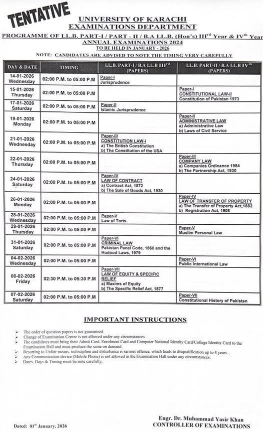 University of Karachi is set to conduct the LLB Part 1 and Part 2 as well as BA LLB Hons 3rd and 4th-year annual exams for 2024 on the scheduled dates. The examination section of Karachi University is making all necessary preparations to ensure that the exams are conducted smoothly according to the official timetable. Students can access the UoK LLB BA LLB Hons Annual Exams 2024 Tentative Date Sheet to stay updated on the exam schedule.