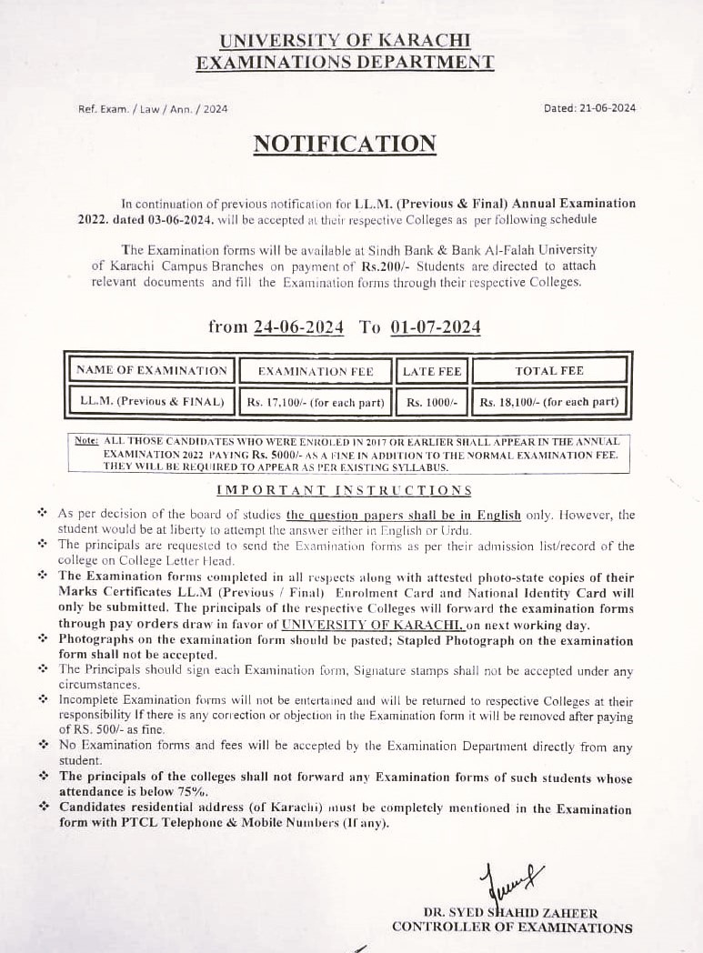 Karachi, University of Karachi is going to conduct the KU LLB Previous & Final annual exams 2022 on the scheduled dates and time. The exams department of Karachi University started receiving the admission forms from the students as per UoK LLB Final Annual Exams 2022 Forms Schedule. The students can get their exams forms from Sindh Bank and Bank Al-Falah University of Karachi campus branches on the payment of form fee of Rs.200/-.