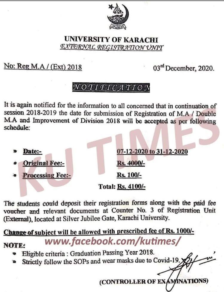 The University of Karachi has snnounced to accept the applications for the registration and improvement of division for Masters for the session 2018-19. It is informed on behalf of the Controller of Examination, University of Karachi; all concerned students have to submit their registration and improvement of division applications 2020. The Registration Unit (External), KU has announced the UOK MA Registration and Improvement of Division Schedule 2020. All candidates are asked to submit their forms from 07-12-2020 to 31-12-2020. Moreover, all students are advised to submit their KU Masters Registration forms 2020 and other related documents at counter No 3 of Registration Unit(External), Silver Jubilee Gate, Karachi University.