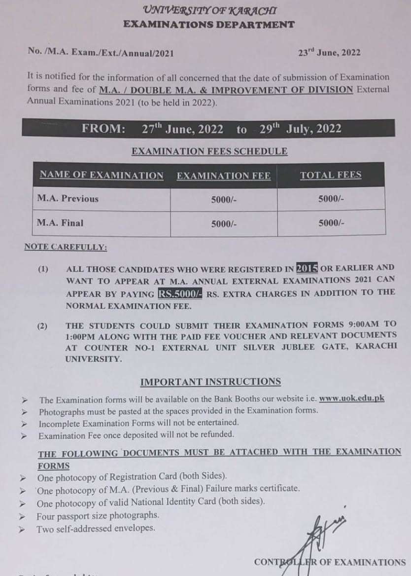Karachi, University of Karachi receives the admission forms from the aspirants, who want to attend their KU MA / Double MA external annual exams 2022. The students, who intend to appear in the MA, Double MA and Improvement of Division exams, they are instructed to submit their application forms with the payment of the single admission fee. The candidates follow the dates to send their admission forms from 27-06-2022 to 29-07-2022 according to their UoK MA / Double MA External Annual Exams 2022 Schedule and they will pay the admission fee on the rate, which is mentioned in the schedule. The students will read the instructions and they should follow them at the time of filling the admission forms and pay the admission fee.