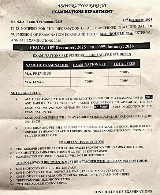 University of Karachi is making all necessary arrangements to manage their MA & Double MA external annual exams for the year 2025 on the given schedule. The students will follow UoK MA/Double MA External Annual Exams 2025 Forms Schedule for the submission of the admission forms and pay the fee in accordance with the timeline, which is shared with the students online.