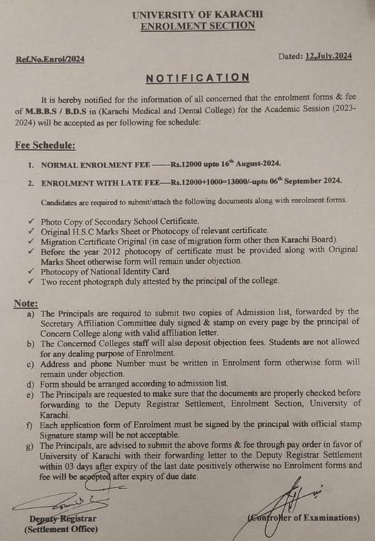 Karachi, University of Karachi has started the process of enrolment of the MBBS and BDS in Karachi Medical and Dental Colleges for the academic session 2023-24. The education department of Karachi University has announced their UoK MBBS / BDS Enrolment Forms 2023-24 Schedule for the submission of the enrolment forms and deposit of the admission fee. The candidates can submit their application forms with the enrolment fee of Rs.12000/- by the final date of 16-08-2024. The candidates can submit their application forms with the deposit of the late fee of Rs.1000/- and total fee comes to Rs.13000/- by the final date of 06-09-2024.