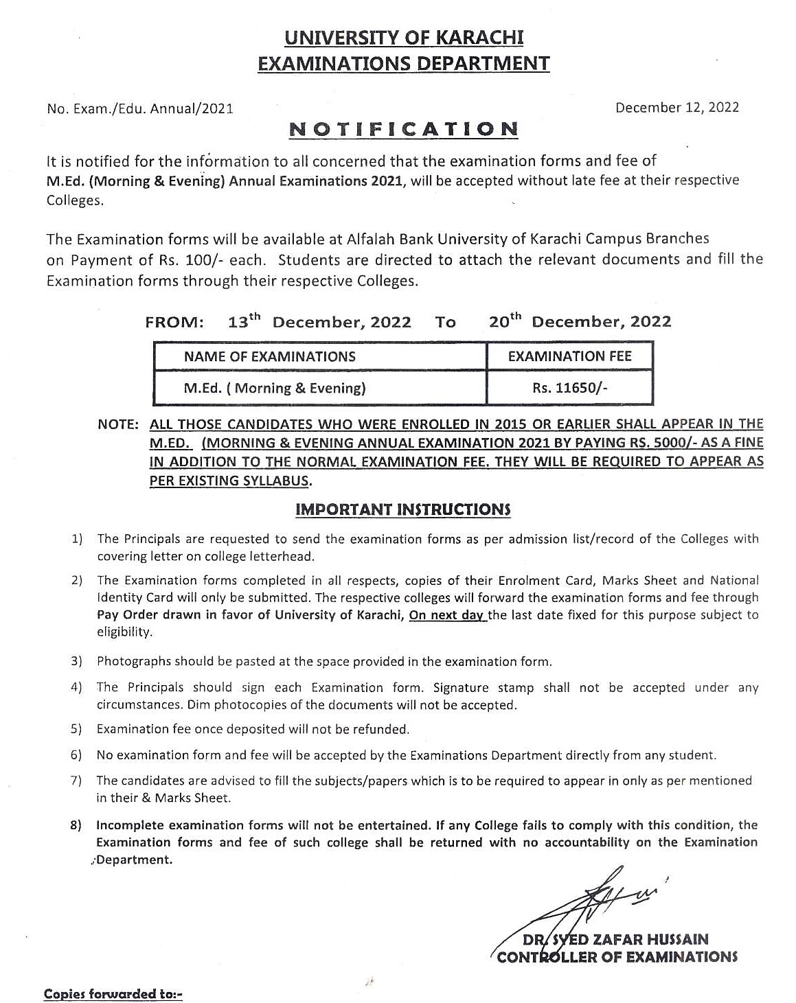 Karachi, University of Karachi is going to start their KU M.Ed Annual Exams 2021 for the morning and evening programs. The candidates will view their UoK M.Ed Annual Exams 2021 Forms Schedule and they will submit their application forms without late fee of Rs.11,650/- from 13-12-2022 to 20-12-2022. The candidates will get the application forms from the Al-Falah Bank, University of Karachi, and Campus branch on the payment of Rs.100/- each. The candidates will attach the relevant documents and they will provide the application forms through their respective colleges.