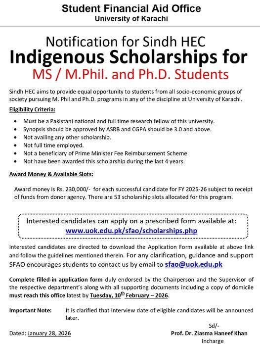 The candidates can visit the official website of Karachi University and they can download this scholarship program forms. The candidates will follow the instructions at the time of filling the forms and they will submit this application form for the award of the UoK Scholarship 2026 by the final date of 10-02-2026.