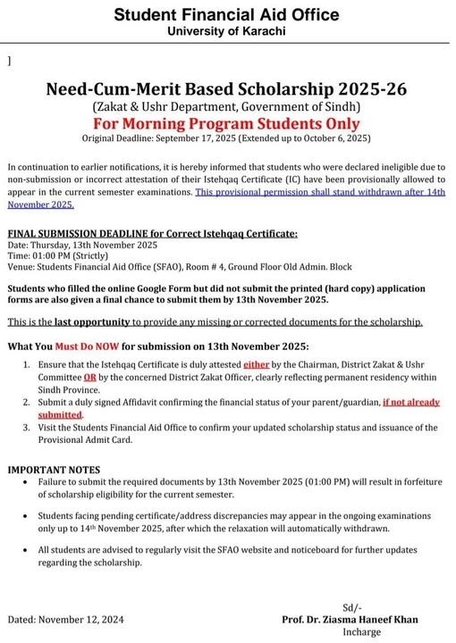 University of Karachi is going to award the need-cum-merit based scholarships to the students, who are getting education in all programs in the morning time. The students, who are enrolled in any program in this university at any level, they can apply for this scholarship. The candidates provided the documents including istehqaq certificate but there are some students, whose names are shown, have submitted the istehqaq certificate having incorrect attestation. The students can get the latest updates of UoK Need-cum-Merit Based Scholarships 2025-26 Morning Programs.