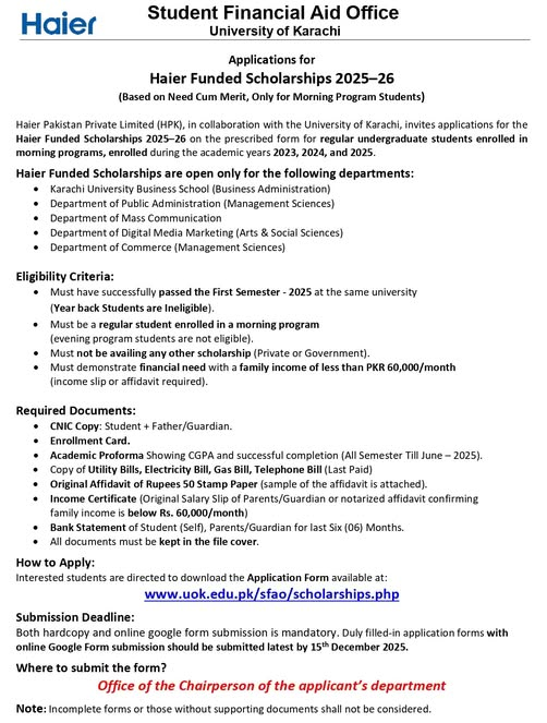 University of Karachi is going to offer the Haier Funded scholarships to the talented students in the undergraduate classes, who are enrolled in morning session Karachi University during the calendar years of 2023, 2024 and 2025.