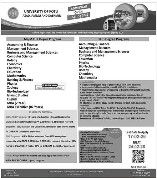 University of Kotli UoKAJK has officially announced UoKAJK Admissions 2026, inviting online applications for Spring 2026 in multiple postgraduate degree programs. This announcement offers a valuable opportunity for students seeking advanced education in science, business, social sciences, and management disciplines at a recognized public sector university in Azad Jammu and Kashmir. With expanding academic infrastructure and research-focused programs, UoKAJK Admissions 2026 are expected to attract a large number of applicants nationwide.