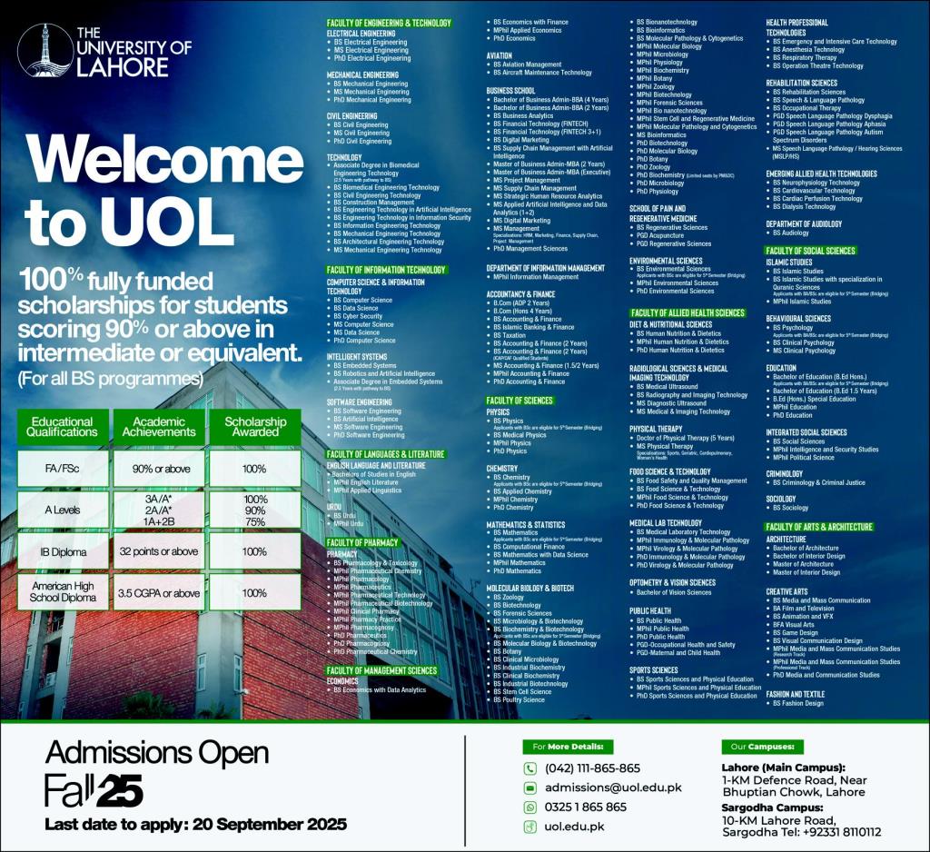 The University of Lahore UOL, one of Pakistan’s premier institutions, is now accepting applications for Fall 2025 — and if you’ve scored 90% or above in Intermediate or equivalent, your entire Bachelors degree could be 100% fully funded.