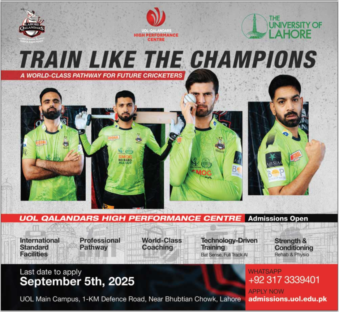 The UOL Qalandars High Performance Centre—a joint initiative of Lahore Qalandars and The University of Lahore—is now accepting admissions for aspiring cricketers who dream of becoming professionals. This world-class cricket training facility offers a complete development pathway, combining international standards, expert coaching, and cutting-edge technology to shape the stars of tomorrow.