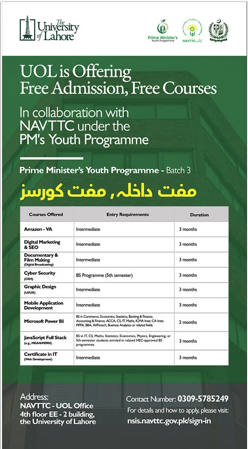 The University of Lahore UOL, in collaboration with NAVTTC under the Prime Minister’s Youth Programme PMYP Batch 3, is offering free admissions and free professional courses for youth. This initiative aims to equip young learners with practical skills and knowledge in high-demand fields, enabling them to enhance employability and career prospects.