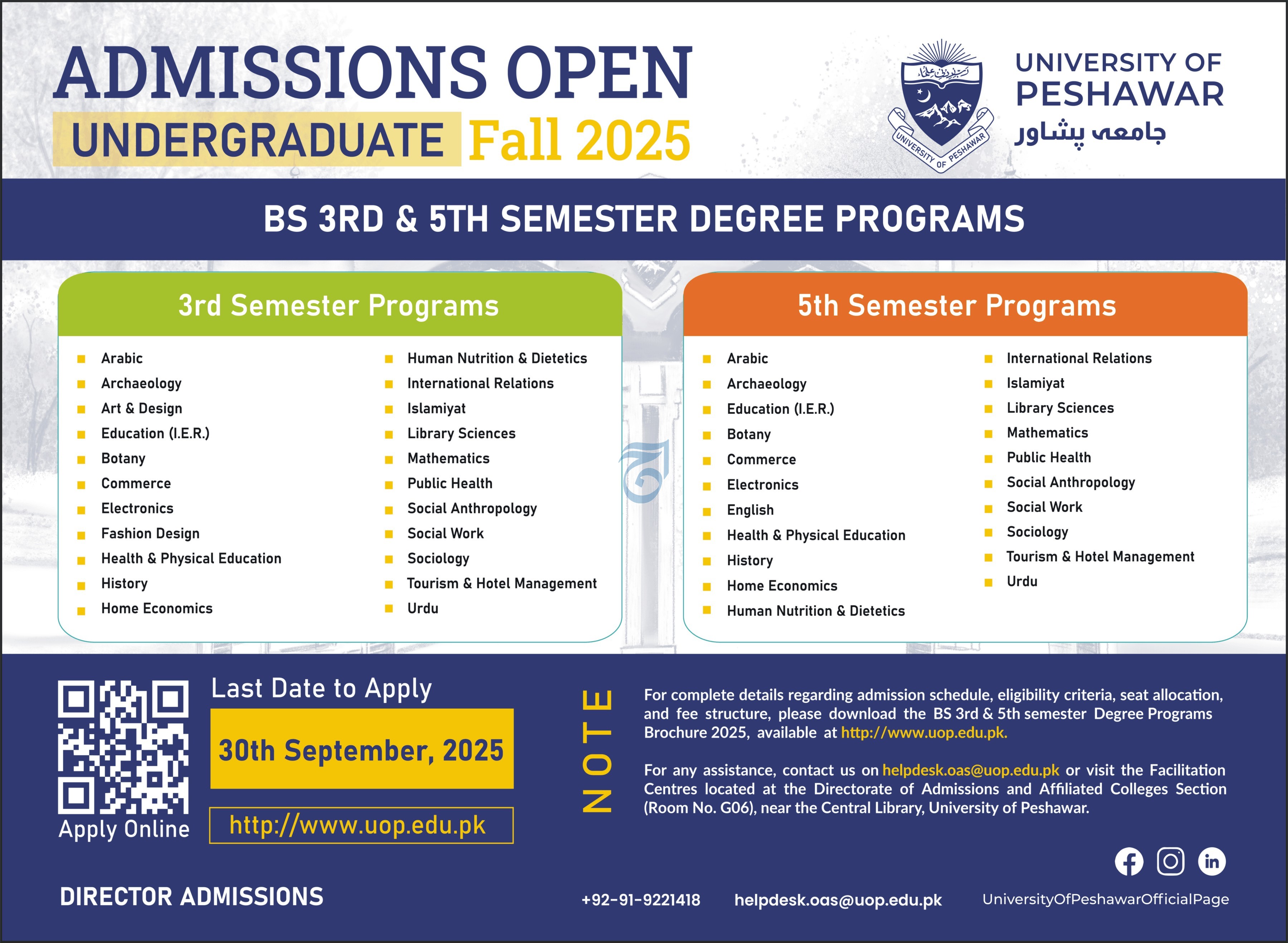 The University of Peshawar UoP — a prestigious institution known for academic excellence and a legacy of producing visionary leaders — is now accepting Undergraduate Admissions for Fall 2025 in 3rd and 5th semester BS degree programs.