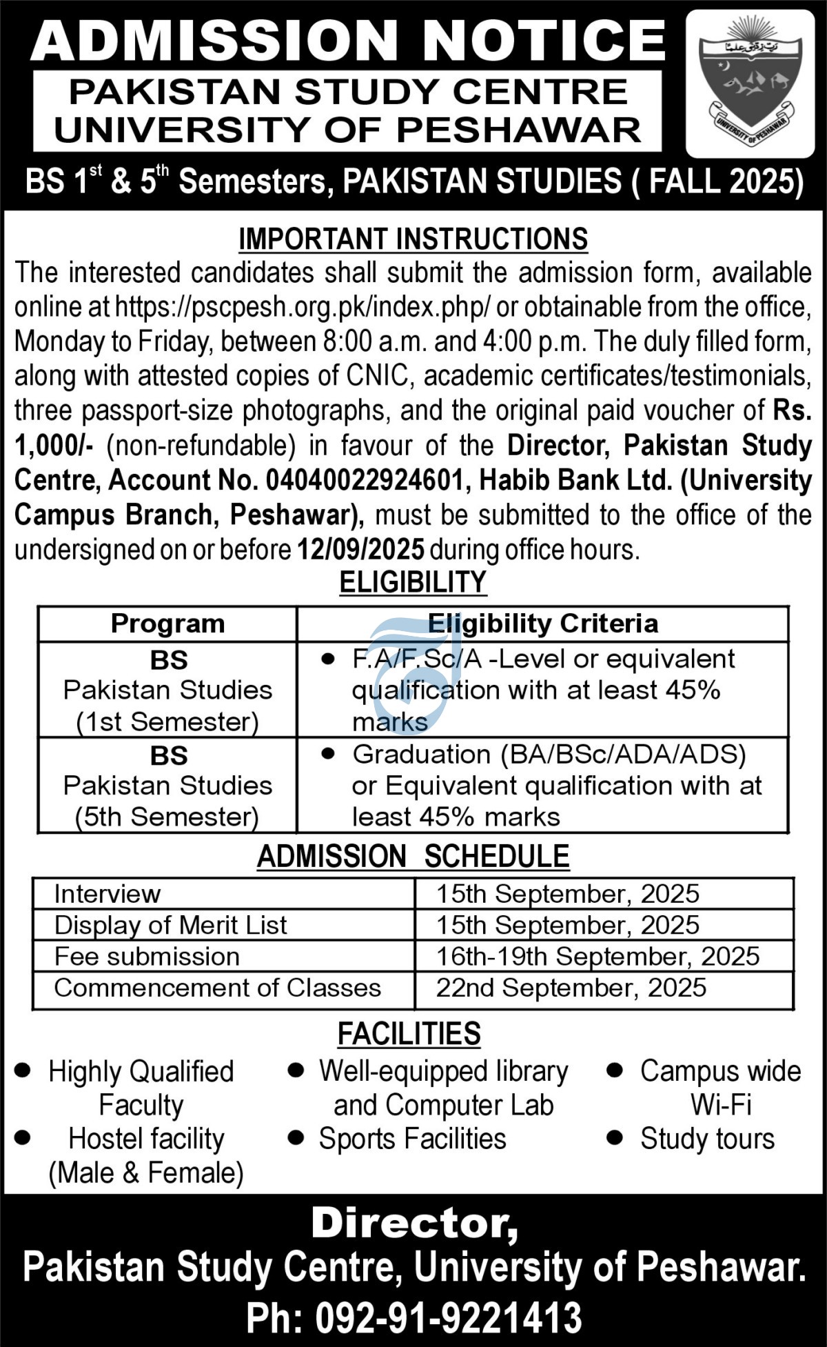 The Pakistan Study Centre, University of Peshawar UoP a prestigious academic and research institution — is now accepting applications for admission to its BS Pakistan Studies program for both 1st and 5th semesters for the Fall 2025 session.