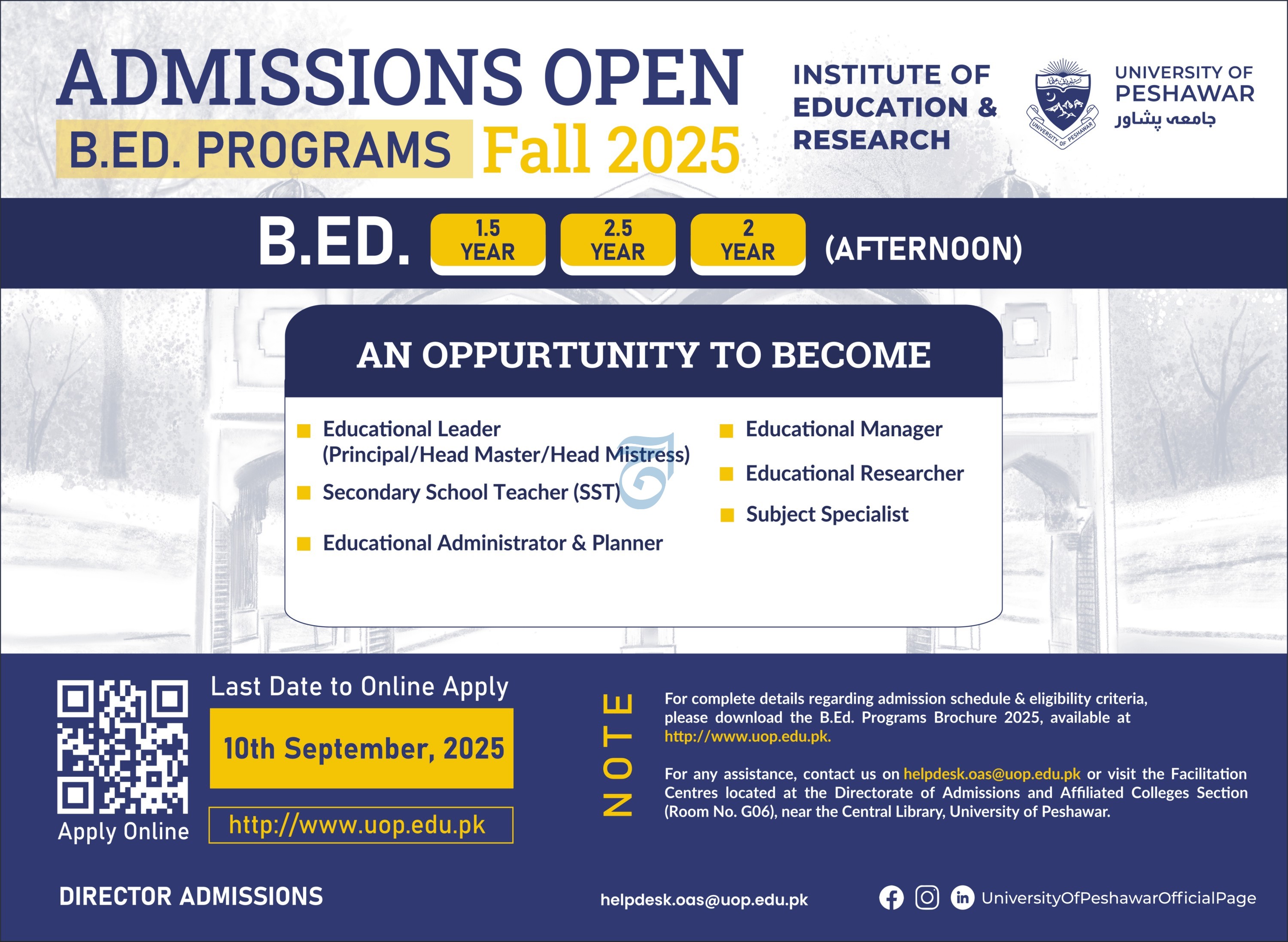The University of Peshawar UoP invites applications for admission to its B.Ed. programs for the Fall 2025 session at the Institute of Education & Research IER — a premier institution known for producing highly skilled educators and education leaders.