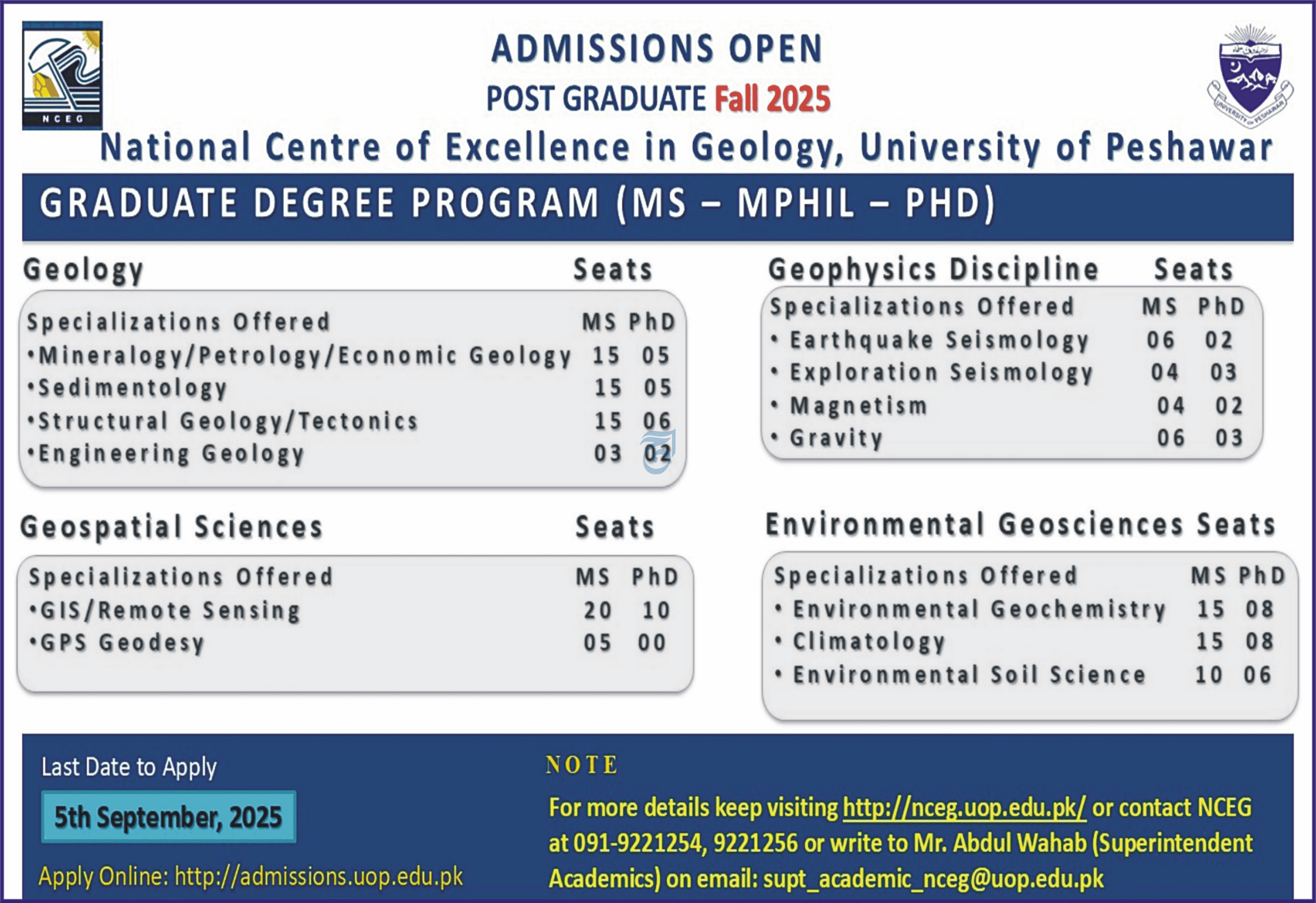The National Centre of Excellence in Geology NCEG at the University of Peshawar UoP is now accepting applications for Fall 2025 Postgraduate Programs. As a premier institution in Earth and Environmental Sciences, NCEG offers MS, MPhil, and PhD programs across a diverse range of geoscience disciplines. These programs are designed to equip students with advanced theoretical knowledge, practical field experience, and cutting-edge research skills.