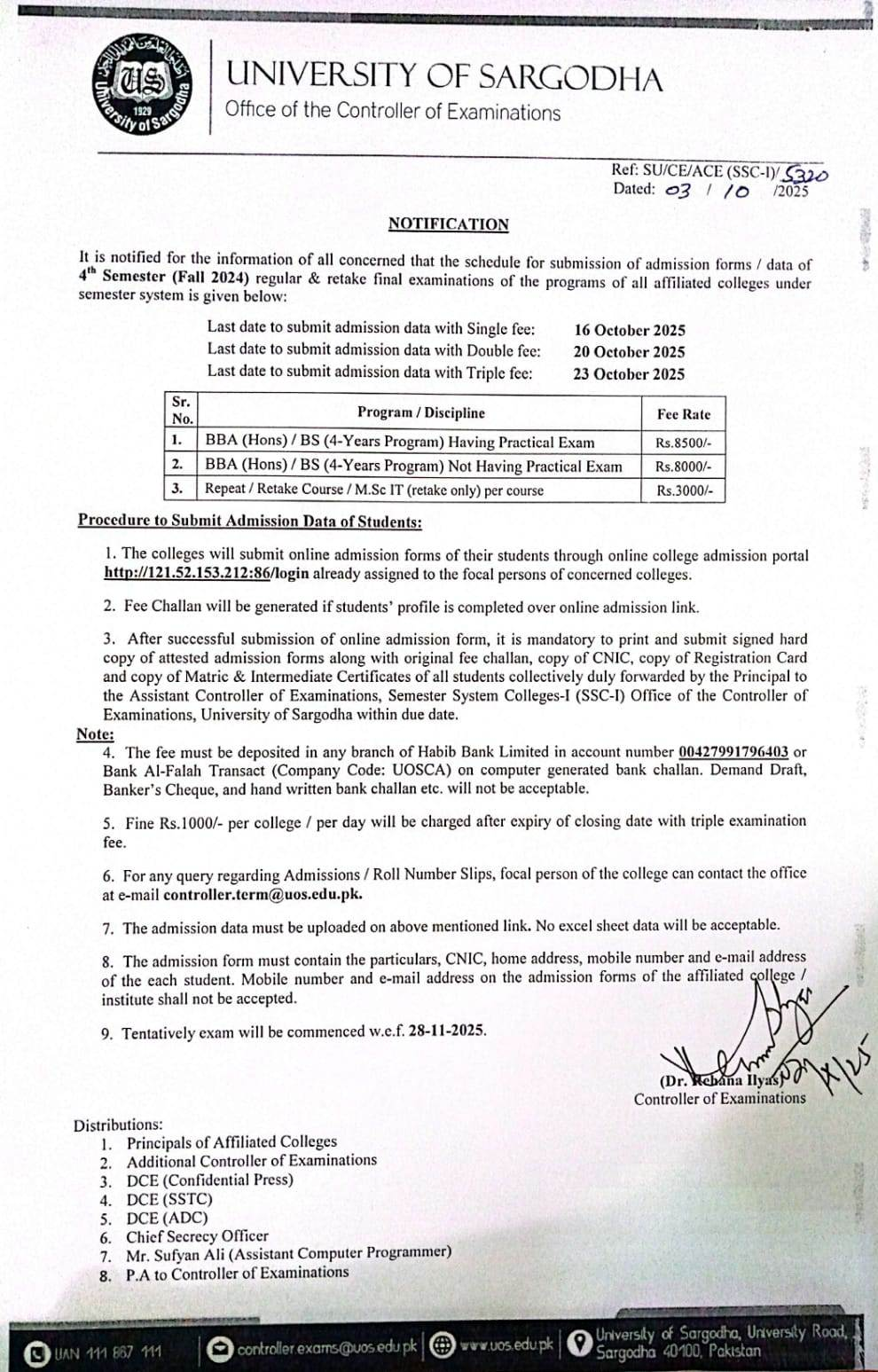 Sargodha, University of Sargodha is going to start their BBA Hons and BS 4 years programs fall 4th semester exams for the year 2024. The regular and retake students can submit their application forms to appear in these exams according to UoS BBA Hons & BS 4th Semester Fall Exams 2025 Forms Schedule. The students of the affiliated colleges can submit their forms in time so that their forms can be processed and they will be provided with their roll no slips and date sheet so that they can be able to appear in the next coming exams.