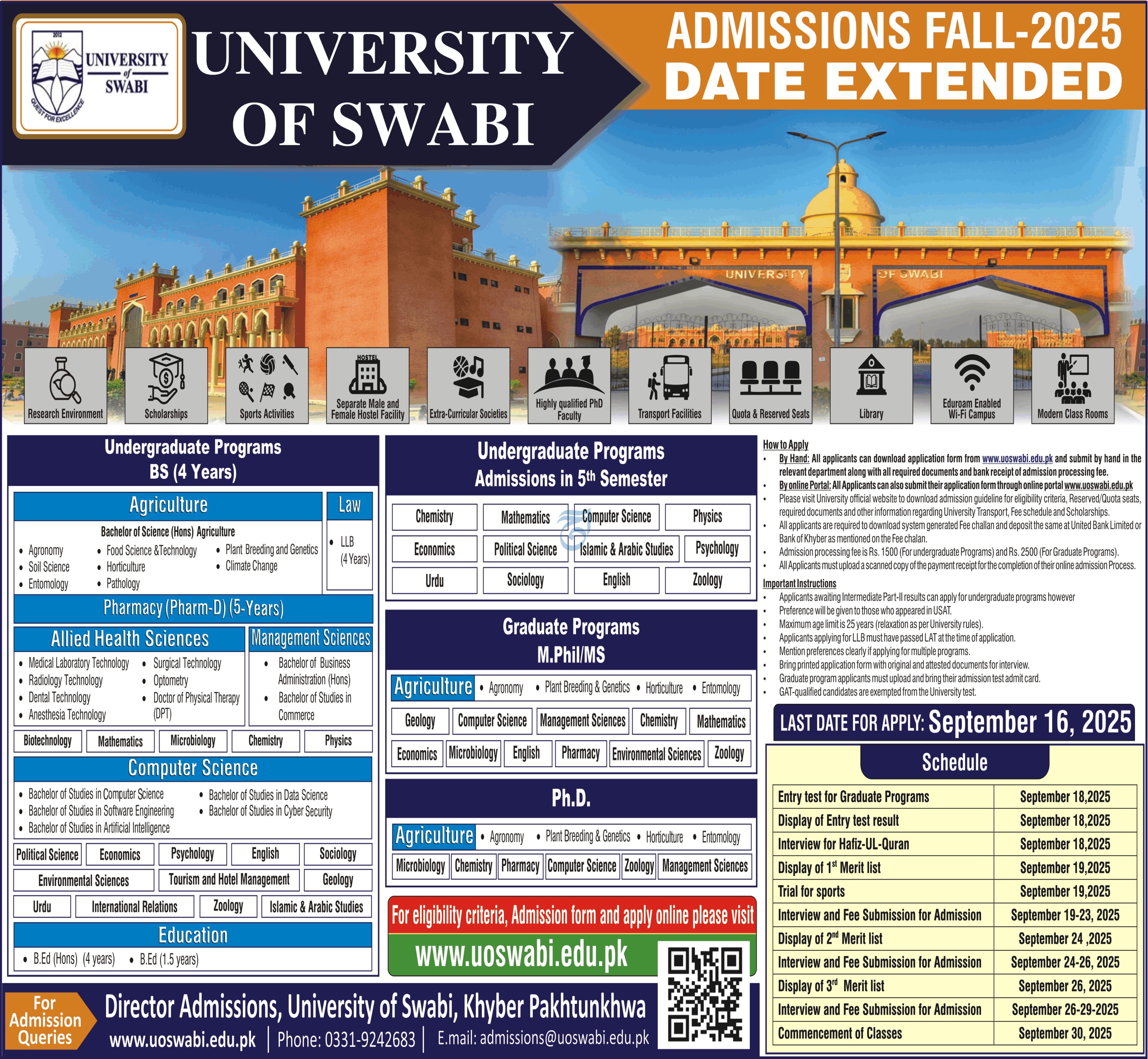 The University of Swabi uoswabi, a leading public sector university in Khyber Pakhtunkhwa, invites applications for Fall 2025 Admissions in a wide array of undergraduate, graduate MS/MPhil, and PhD programs. With a strong commitment to academic excellence, modern infrastructure, highly qualified PhD faculty, and a vibrant campus life — University of Swabi is the ideal destination for students ready to shape the future.