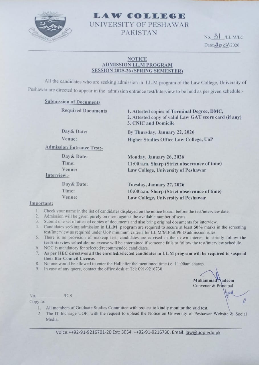 - Document Submission: Candidates must hand in verified copies of their final degrees, DMCs, identity cards, and Law GAT scores to the Higher Studies Office by Thursday, January 22, 2026.