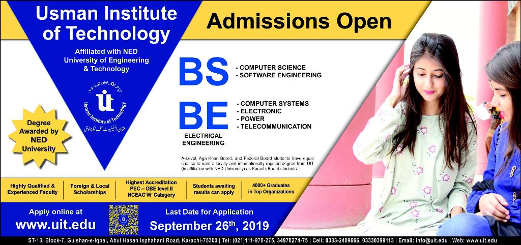 Usman Institute of Technology BS admissions 2019